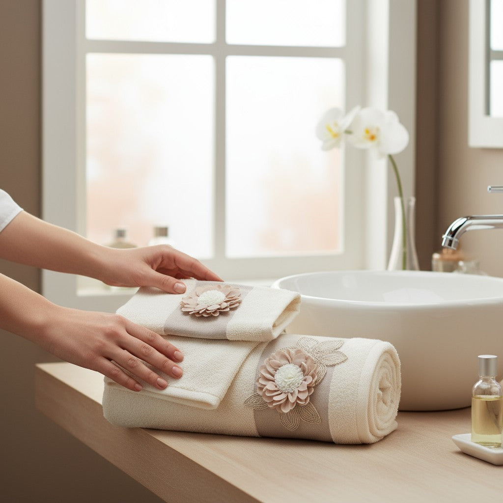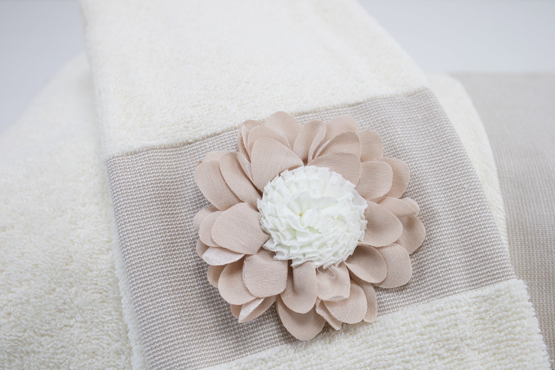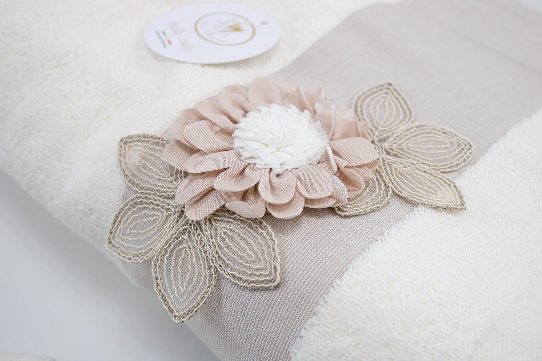 Bath towel set made of 100% cotton sponge and finished with a beautiful ruffle with applied flower.