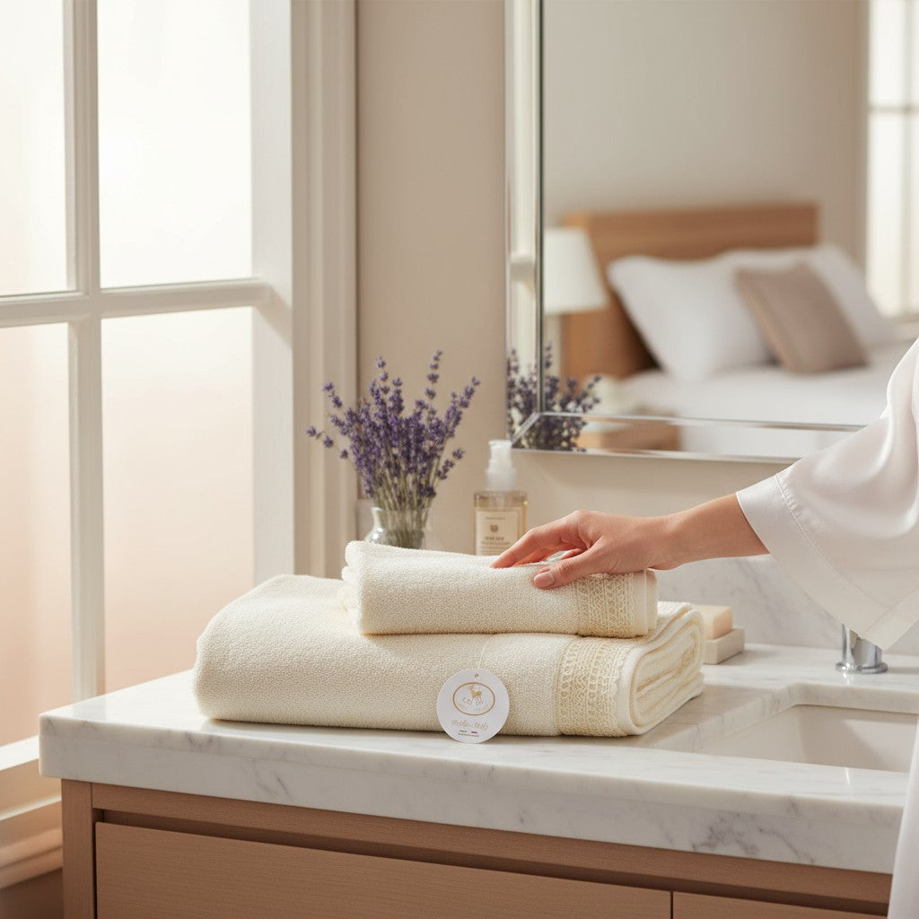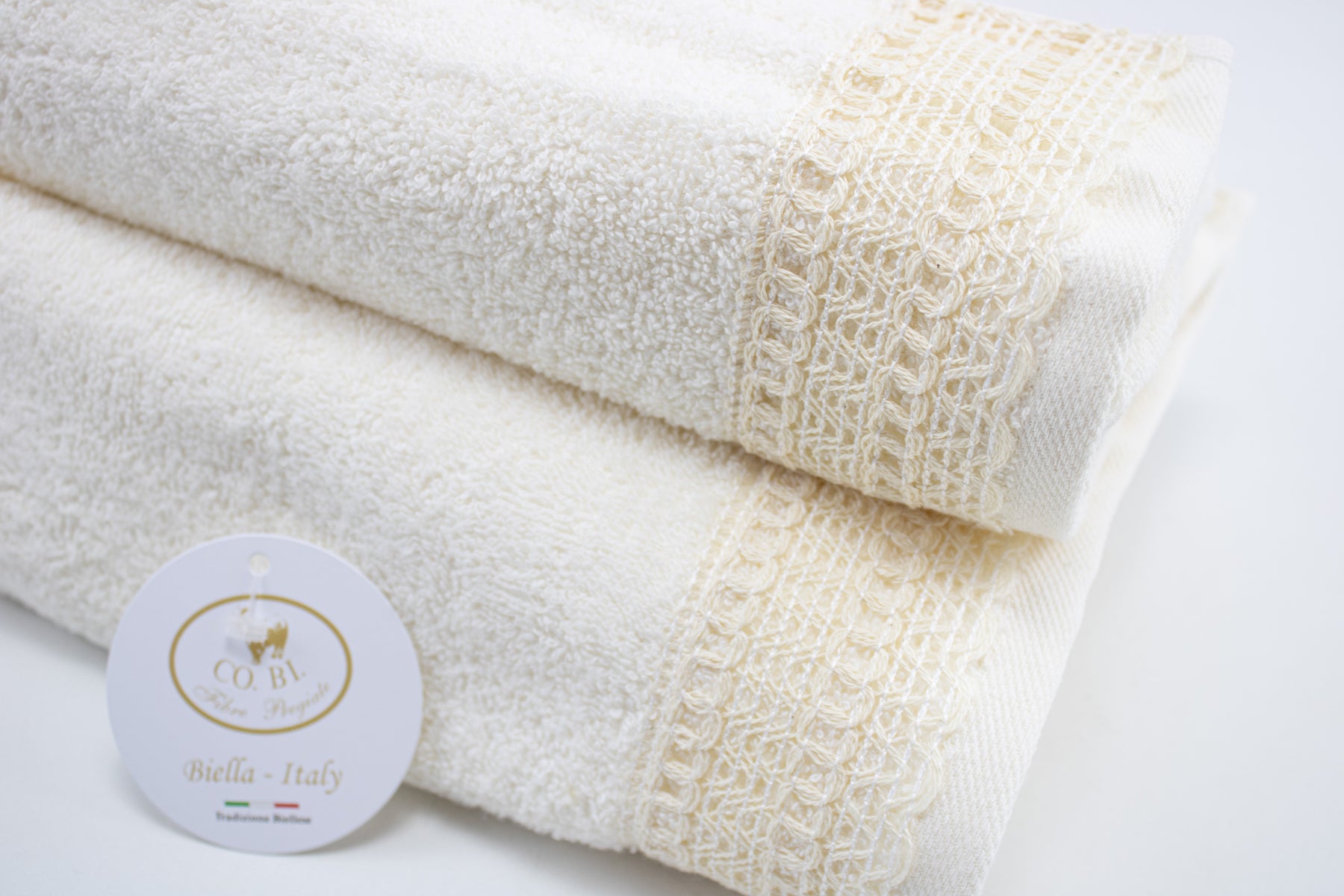 The pair consists of a face towel and a guest towel: very full-bodied, absorbent and soft sponge.