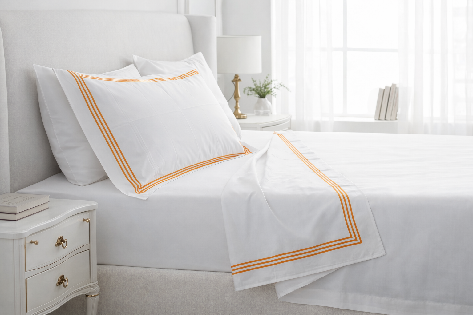 Lenzuola matrimoniali bianche con triplo cordonetto arancione