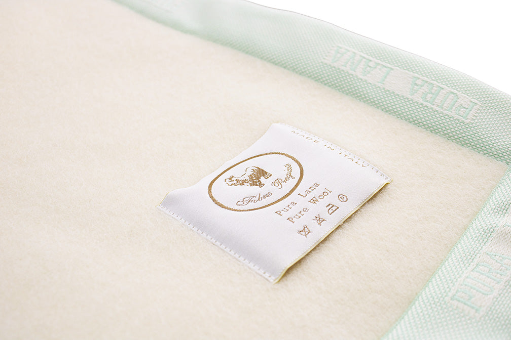 Coperta rifinita con bordo stampigliato verde acqua PURA LANA in tessuto