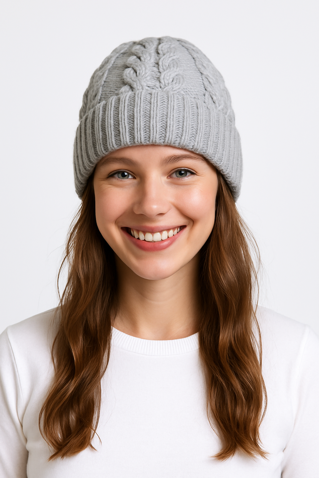 Moderna Cuffia unisex lavorata a maglia con treccia e bordo a costa nei colori naturali del Cashmere. Molto calda, morbida e alla moda.