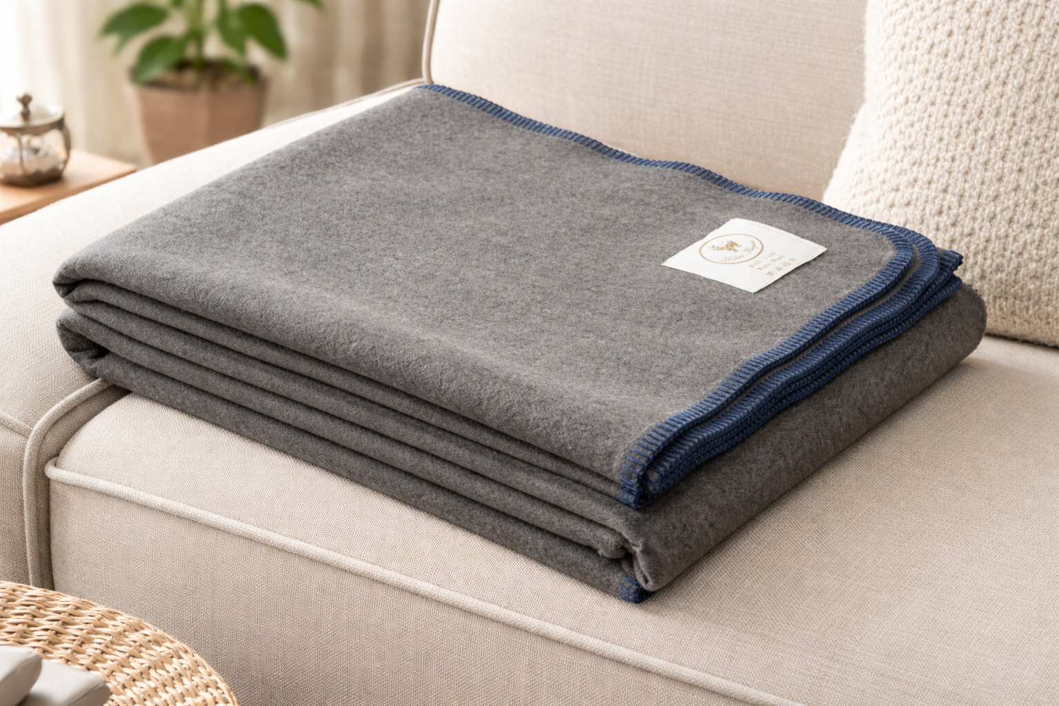 Particolare plaid di lana color grigio fumo e bordo blu